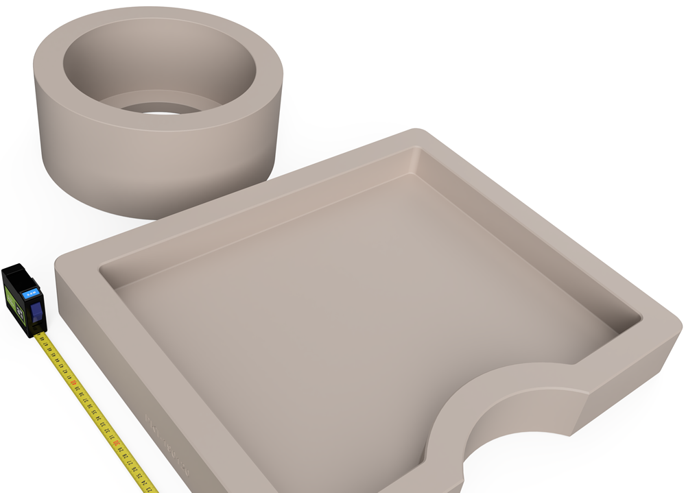 画像上部のPEEKの円筒形パーツは、外径350mm、高さ150mm、肉厚40mm、と大型で肉厚があります。PEEKペレットより大型極厚成形によって素材を作り、切削加工を経て納品した実績のあるものです。